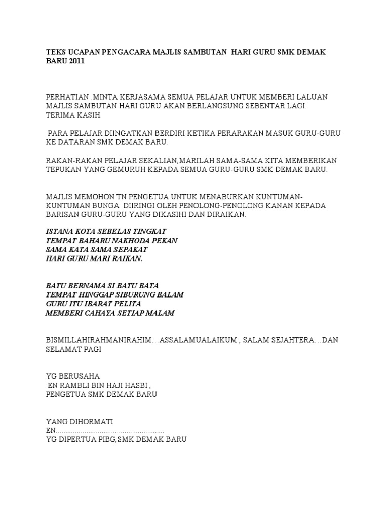 Teks Ucapan Pengacara Majlis Sambutan Hari Guru Smk Demak Baru 2011
