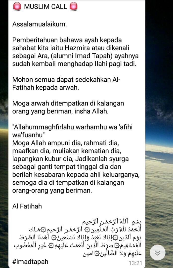 Kami doakan roh allahyarham ditempatkan di kalangan hambanya yang soleh dan beriman katanya. Semoga allah terangkan kuburnya dan semoga ditempatkan di kalangan para syuhada dan ditempatkan di dalam syurga firdaus. Semoga rohnya ditempatkan dalam kalangan orang beriman. Takziah buat xxxxxx dan keluarga di atas pemergian xxxxx kerahmatullah hari ini.