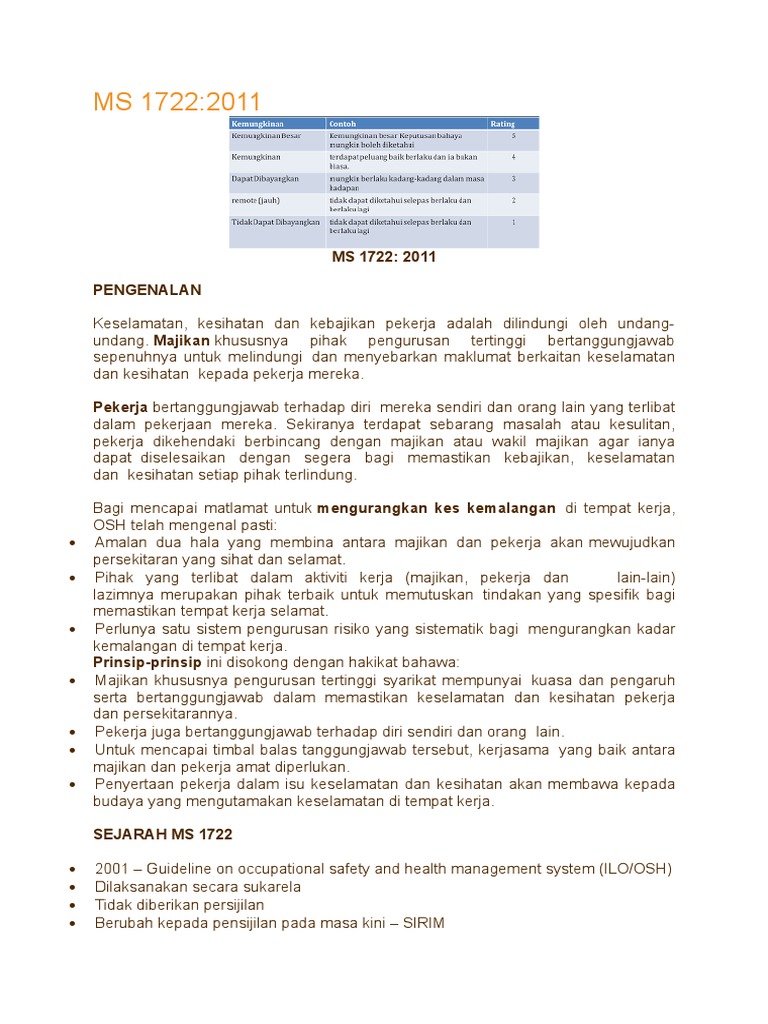 Ms 1722 Sistem Pengurusan Keselamatan Dan Kesihatan Pekerjaan