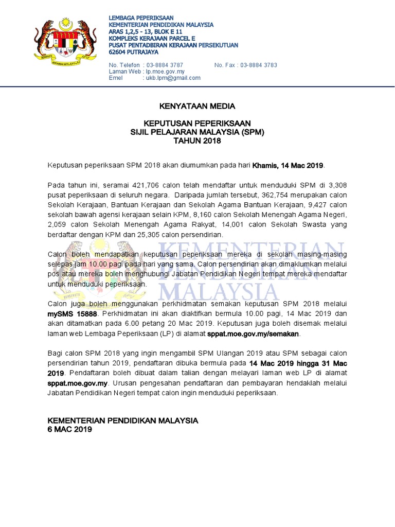 Tarikh rasmi pengumuman semakan keputusan spm 2019 dikeluarkan spm results 2019 keluar pada mac 2020. 2015 3 mac. Calon calon boleh mendapatkan keputusan peperiksaan spm 2018 mereka dari sekolah masing masing selepas 10 pagi pada tarikh keputusan spm diumumkan iaitu pada 14. Begitu juga apabila anda semak keputusan pt3 walaupun result yang diperolehi tidak seperti yang anda inginkan masih ada peluang seterusnya untuk anda.