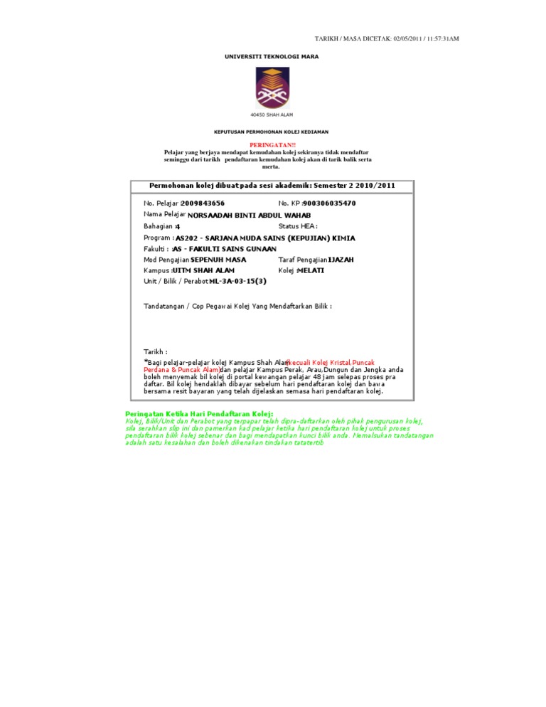 Kriteria Kelayakan Kemudahan Kolej Unit Pengurusan Kolej Non Resident Uitm Kampus Seremban Facebook