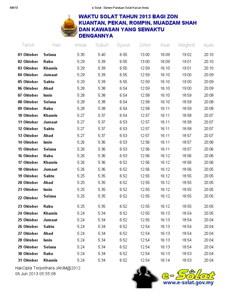 Waktu Solat Tahun 2013 Bagi Zon Kuantan Pekan Rompin Muadzam Shah Dan Kawasan Yang Sewaktu Dengannya